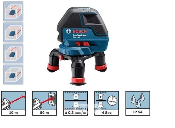 Máy cân bằng Laser 3 tia đỏ Bosch GLL3-50 với tia laser màu đỏ tươi, nét của tia nhỏ. Máy Bosch GLL3-50 có thể đo cả trong nhà lẫn ngoài trời sáng. Sai số tiêu chuẩn của máy cân bằng laser Bosch GLL3-50 : 0,5mm/ 10m đo thông thủy. Phạm vi đo chính xác cao từ 15-20m. Khoảng cách đo xa có thể phát tới là 30m. Tia ngang với góc mở rộng cho dải quét lên đến 120°. Máy Bosch GLL3-50 với nguồn điện Pin thông dụng với 4xAA  LR6  1.5 V. Thời gian làm việc liên tục lên đến 12h. Phù hợp cho mọi điều kiện công trình.
